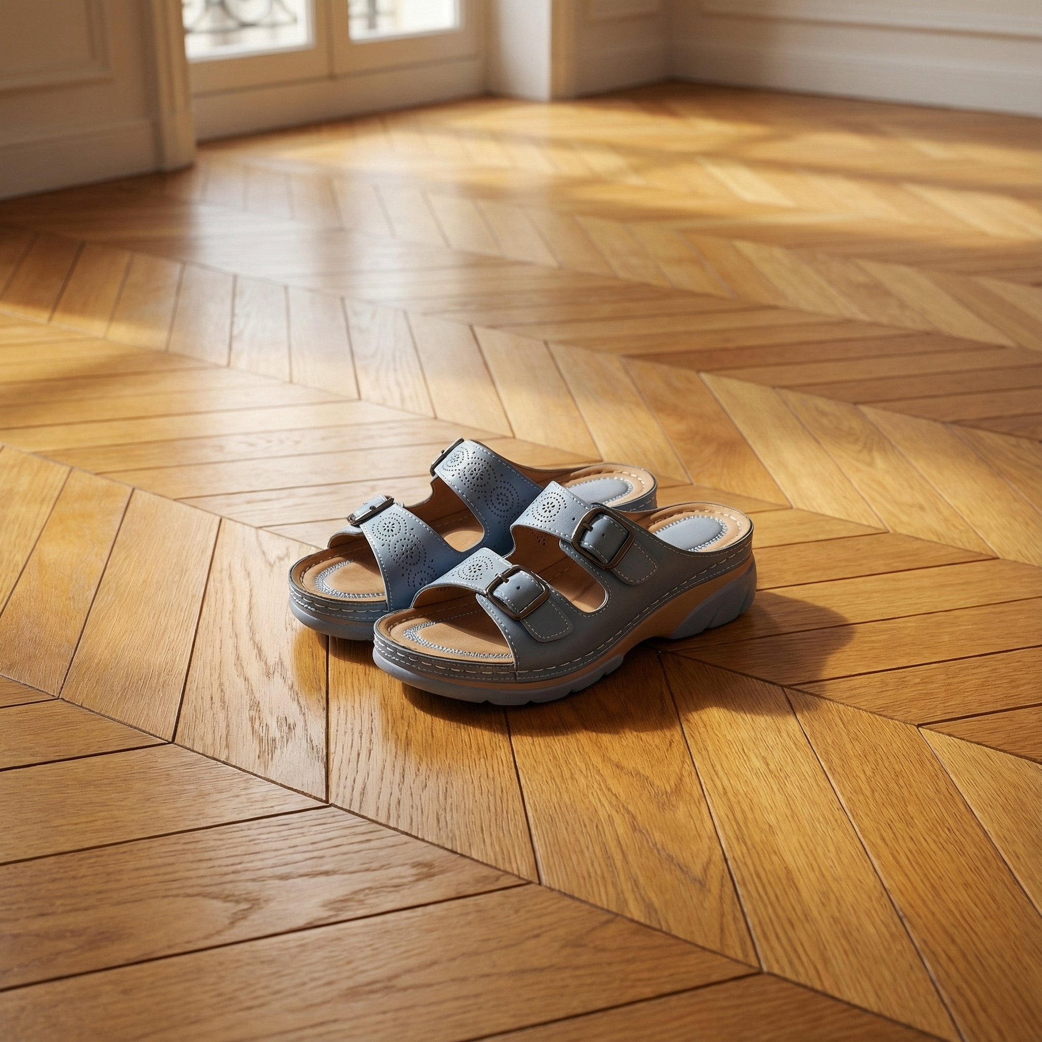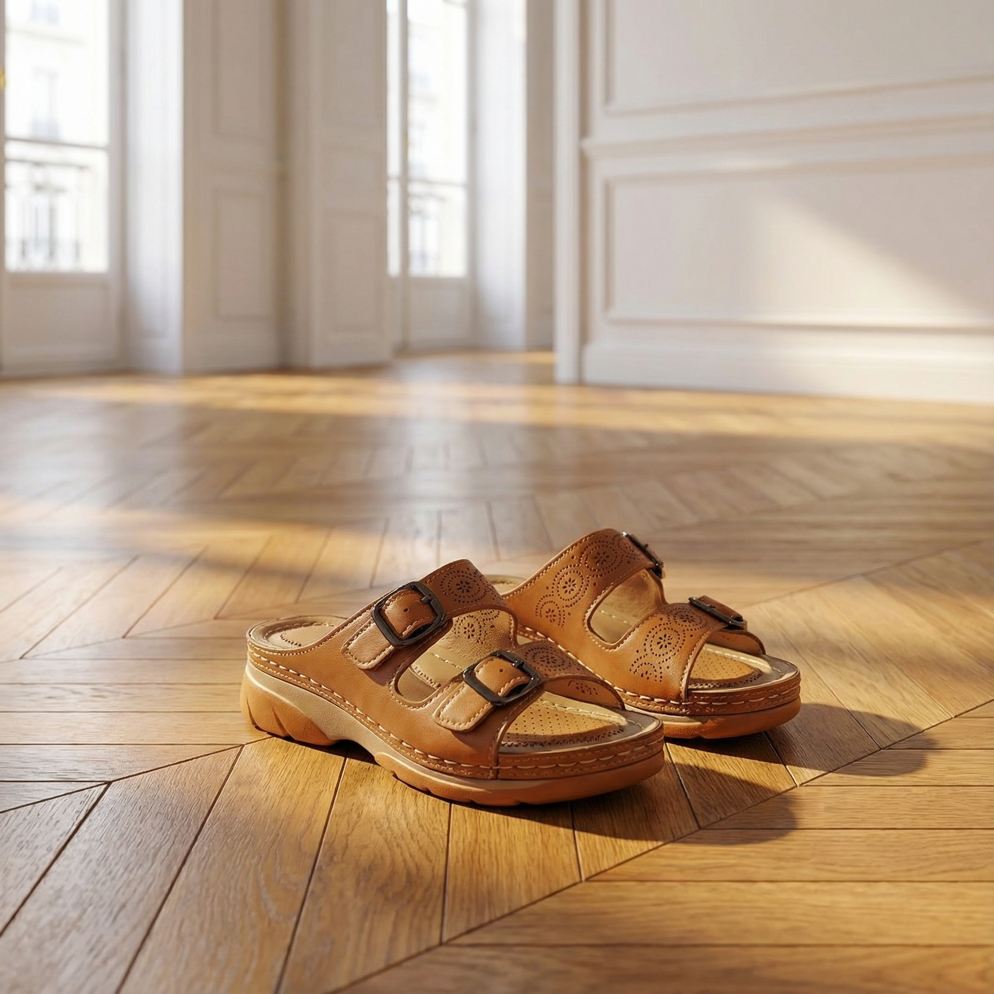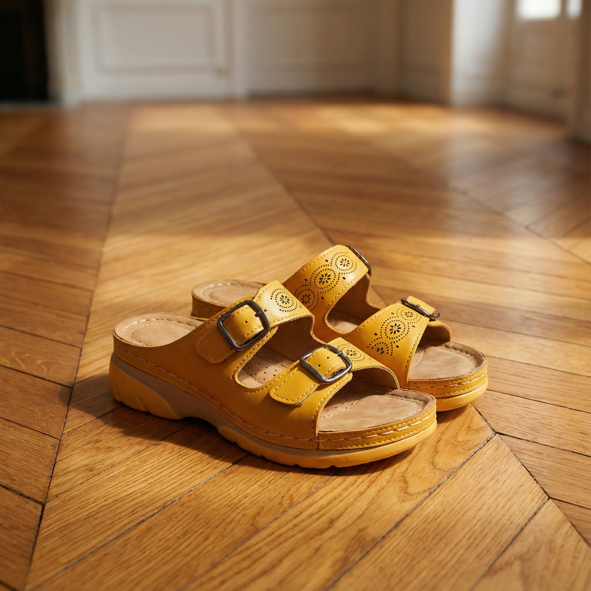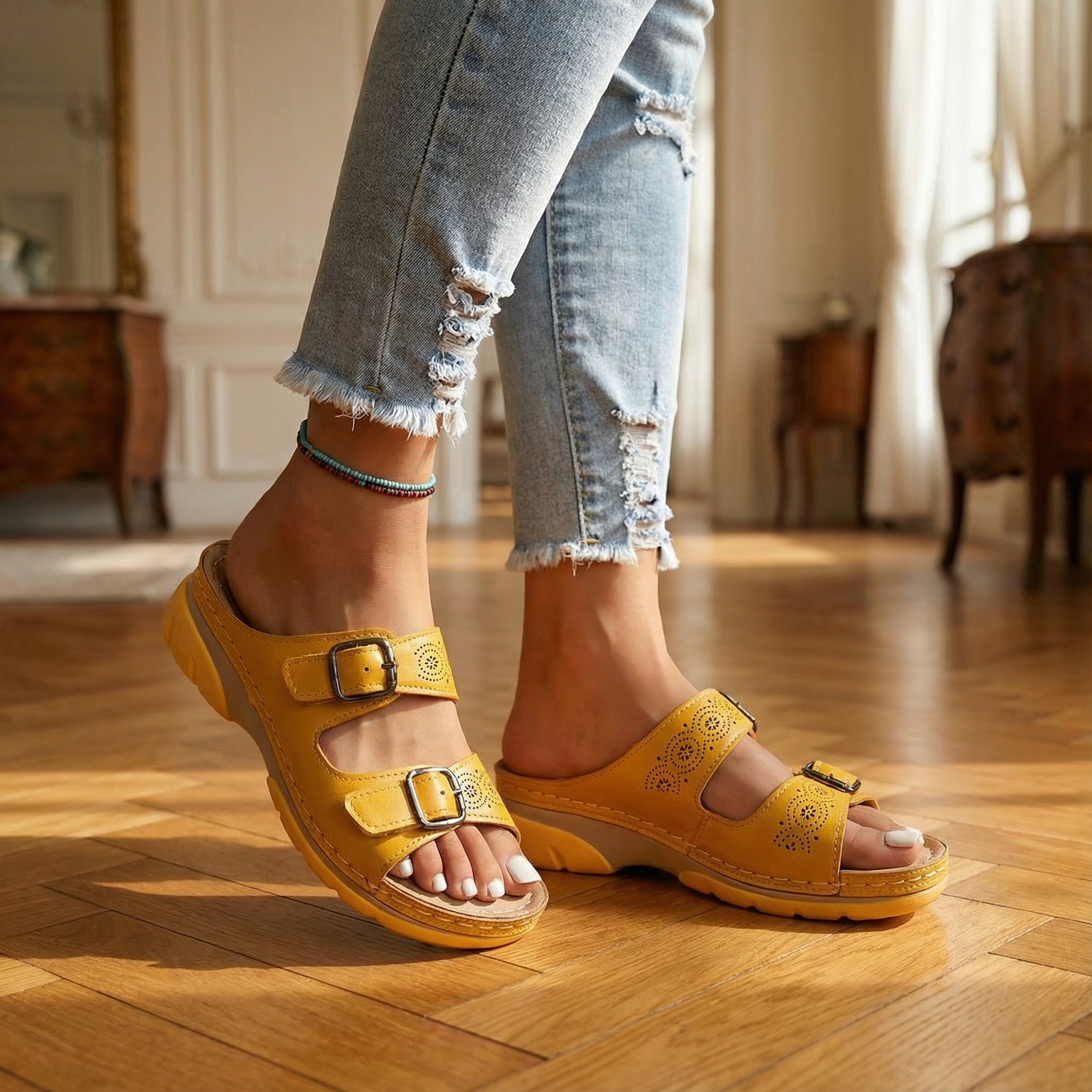 Women's slide sandals with perforated upper and dual buckle strap closures. Features open toe design, cushioned insole, and rubber sole with platform base. Suitable for casual wear, everyday outings, or relaxed styling.